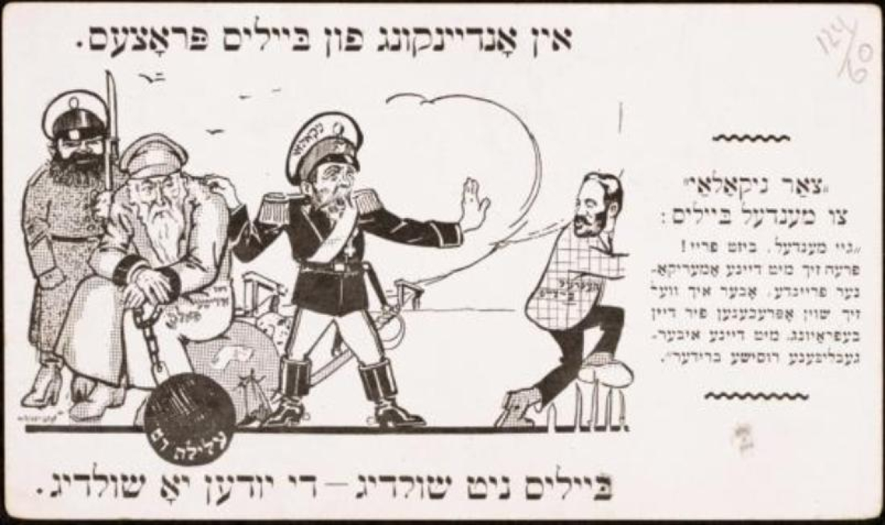 β€œIn Memory of the Beilis Trial: Beilis Not Guilty, Jews Guilty.” Yiddish postcard. Artwork by Mitchel Loeb.