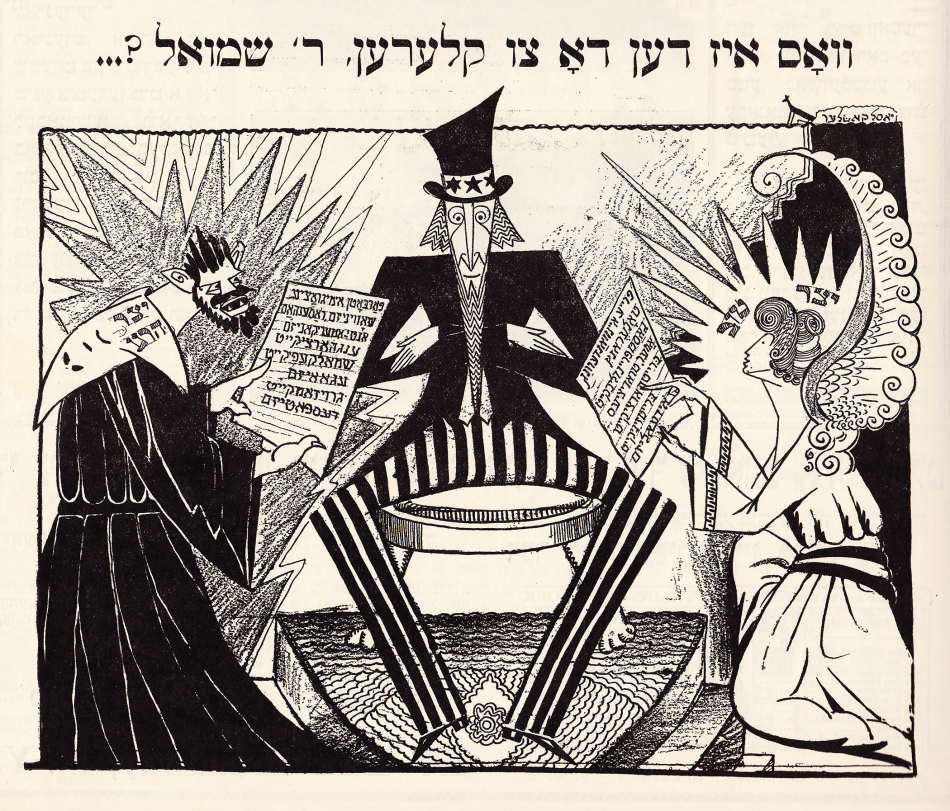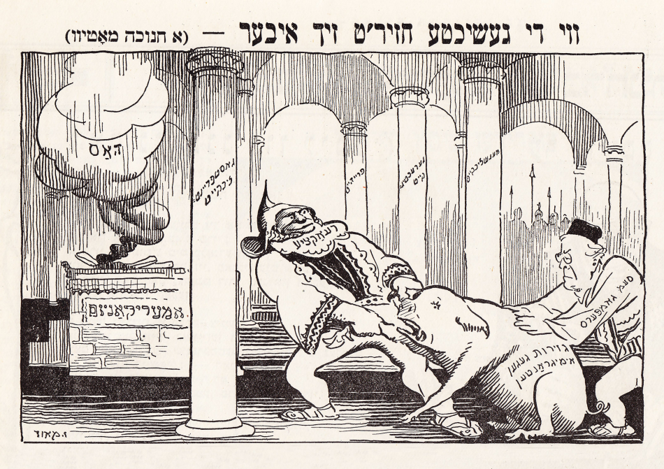 Taking aim with their poison pens, Der groyser kundes, the Lower East Side’s premier Yiddish satire weekly, attacked the Immigration Quota Acts of 1921 and 1924, which were enacted to severely stifle Jewish immigration to the U.S. Well-acquainted with the dire circumstances in which Eastern European Jews found themselves, Yiddish cartoonists understood that a more fair immigration policy would be beneficial to both Jews and to America. Using political, cultural, and traditional Jewish imagery, the artists of Der groyser kundes crafted numerous cartoons that considered the situation from the perspective of a Jewish immigrant community for which the matter was potentially a matter of life and death.