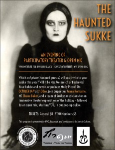 Romaine’s first stint for YIVO, “The Haunted Sukke,” her immersive-theater brain-child created with street theater troupe The Sukkes Mob, premiered at KlezCanada this summer to great acclaim. Among other things, it’s an effort to get Jews reacquainted with that most pagan and party-friendly of Jewish holidays, the feast of booths. In Hasidic communities, Romaine notes, sukkes is a time for serious celebration: get off the subway at 18th Avenue in the middle of the festival week and witness bounce castles, costumes, dancing, and food. Transmitting this sense of glee to other Jews should be easy, but Romaine also wants it to be rooted in the ancient history of the holiday: namely, the tradition of inviting ushpizin – honored guests and influences – into the sukke. Traditional ushpizin include Moyshe Rabeynu, Avraham, Yitzhak, Yaakov, Rokhl, Rivke, and Leah. A former YIVO sound archivist, Romaine’s ushpizin might range from Max Weinreich to Adrienne Cooper to Avraham Sutzkever, Isaac Bashevis Singer, and beyond.